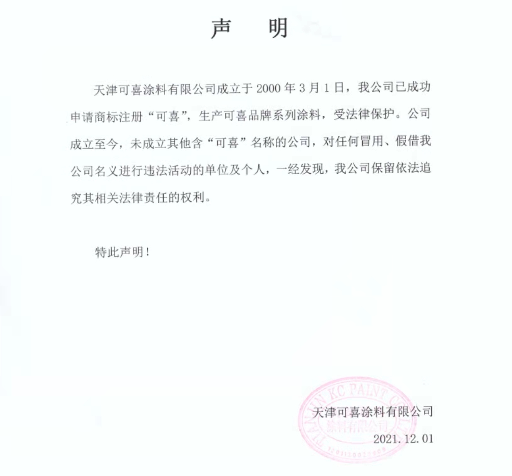 可喜涂料聲明